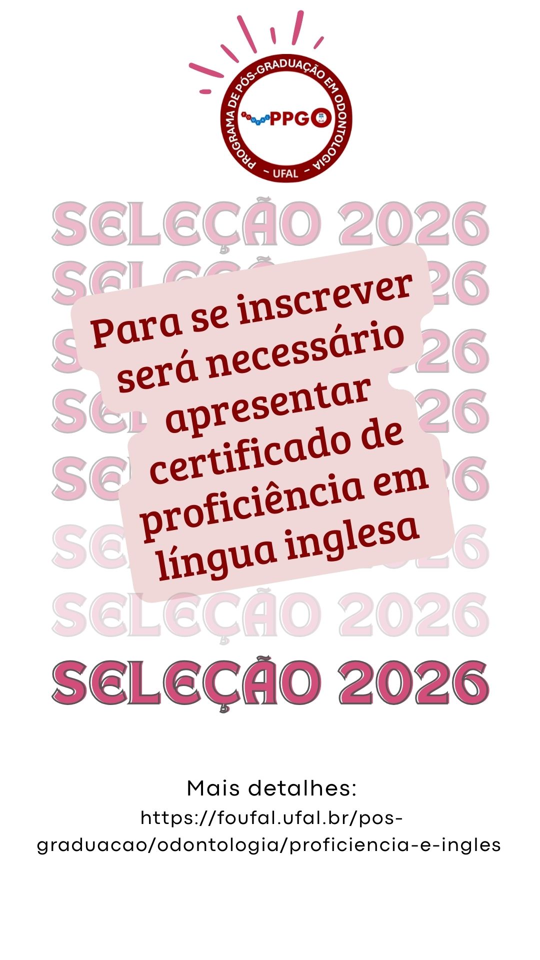 IMPORTANTE https://foufal.ufal.br/pos-graduacao/odontologia/selecao/proficiencia-em-lingua-estrangeira/instrucoes-gerais/selecao-2026.jpg/view https://foufal.ufal.br/@@site-logo/logo-foufal.png IMPORTANTE SELEÇÃO 2026.jpg Documento (199.8KB) Baixar